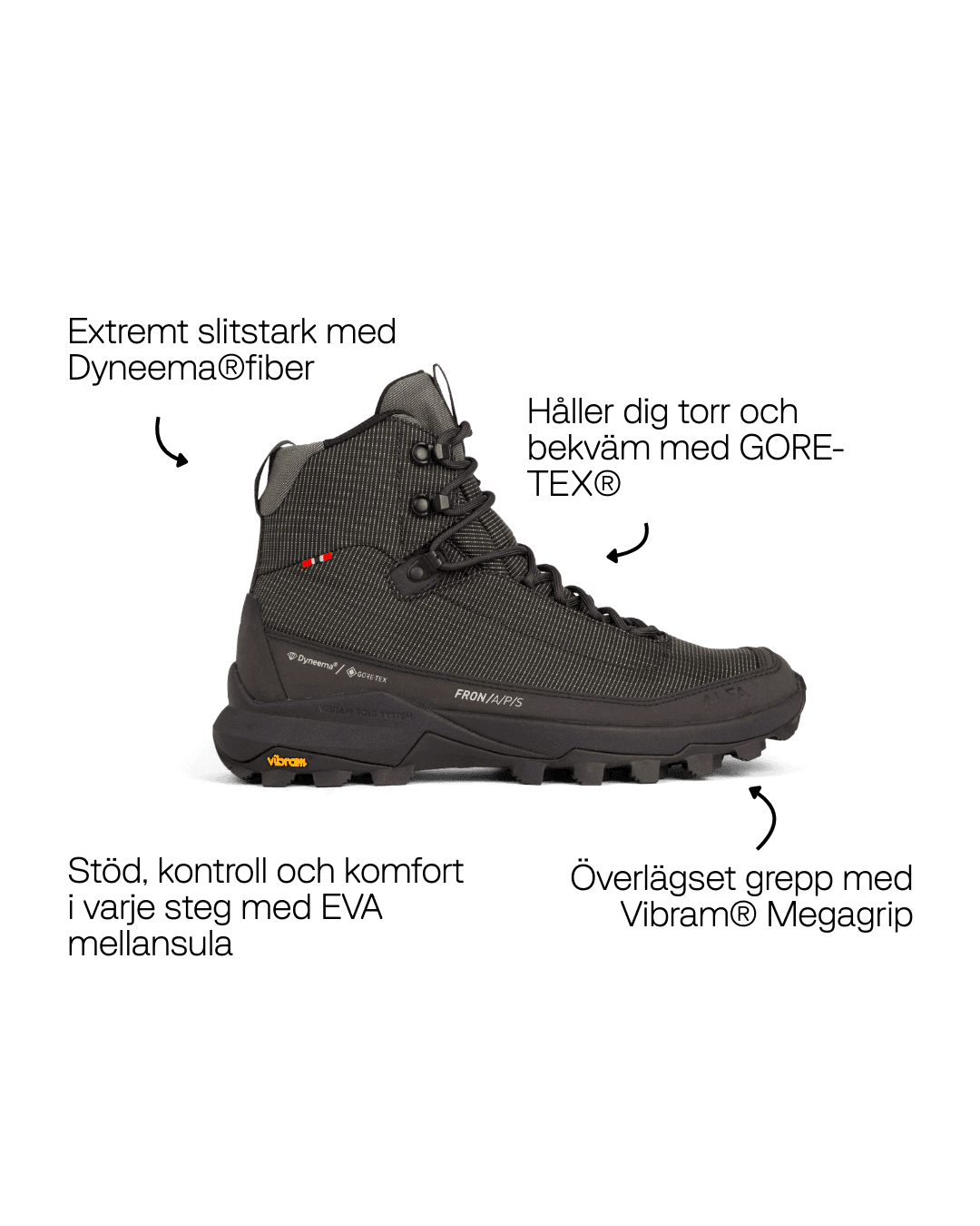 Dyneema® er et høyst innovativ fiber som er 15 ganger sterkere enn stål i forhold til vekt, samtidig som den er ekstremt lett og slitesterk. I Fron brukes Dyneema® i overdelen og i stretchgamasjen som omslutter ankelen. Resultatet er en sko som tåler utfordrende terreng, holder vann og smuss ute, og samtidig opprettholder et lett fotavtrykk — med forbedret holdbarhet.