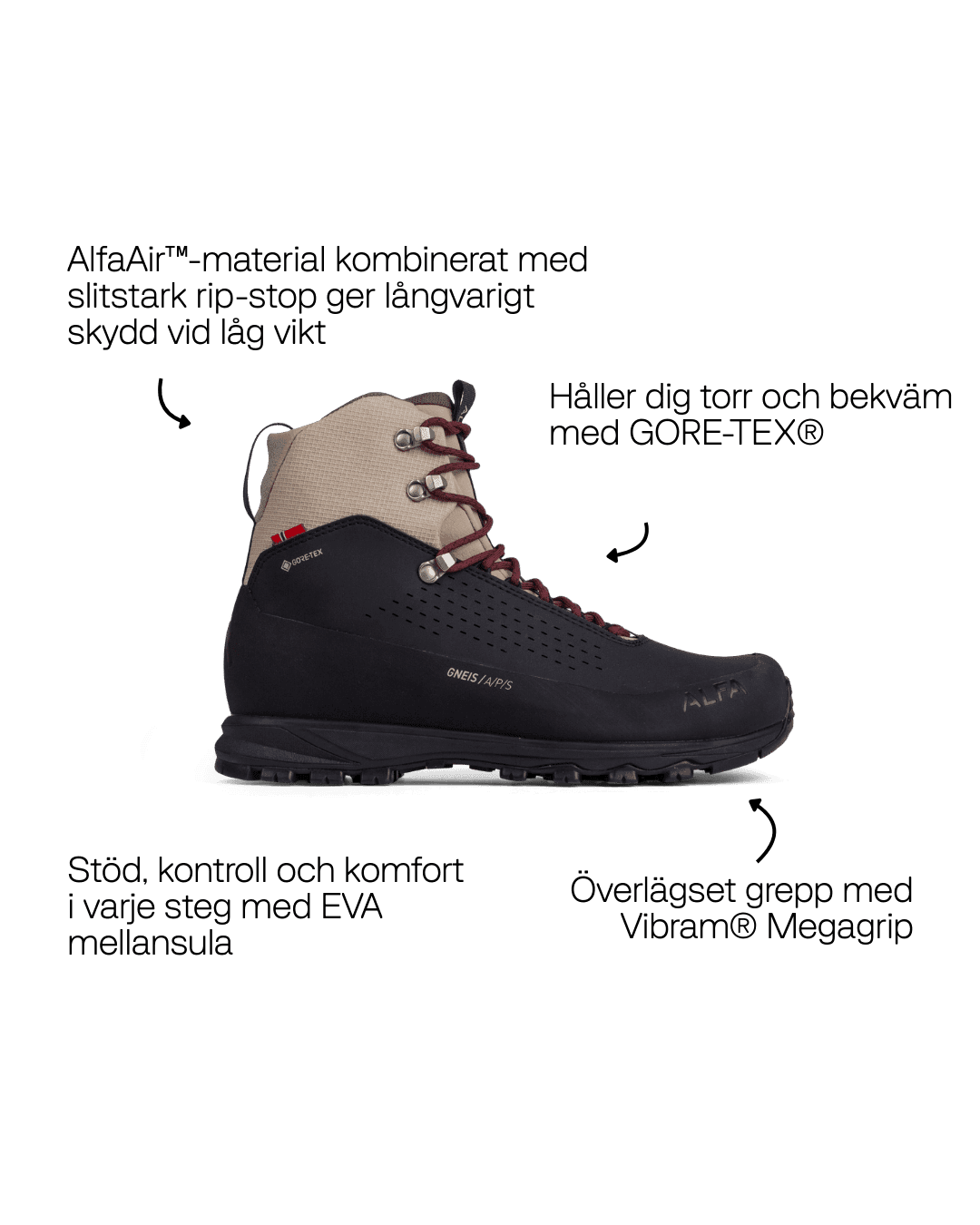 Gneis har en vanlig passform, og ALFA Double Lock-systemet gjør det enkelt å justere og tilpasse passformen til føttene dine. Kombinert med en lett EVA-mellomsåle er Gneis bygget for komfort og er den perfekte følgesvennen når stien din leder deg gjennom et bredt spekter av terreng.
