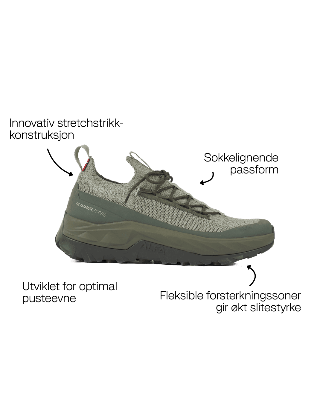 Glimmer er utviklet for aktive dager der komfort, fleksibilitet og pusteevne er avgjørende. Med en innovativ strikket overdel gir den en sokkelignende passform som tilpasser seg naturlig til foten, samtidig som den gir støtte og stabilitet der det trengs mest. Hvorfor velge Glimmer? Presis sokkelignende passform Den stretchstrikkede konstruksjonen går sømløst fra kragen til U-throat og omslutter foten for en tett, adaptiv passform som beveger seg naturlig i hvert steg. Pustende komfort hele dagen Den stretchstrikkede overdelen sørger for kontinuerlig luftgjennomstrømning samtidig som den holder strukturen – og holder føttene kjølige og komfortable under aktivitet. Sikker låsing av mellomfoten Et snøresystem med jevn stramming låser mellomfoten for stabilitet og forhindrer løs hæl, selv ved dynamisk bevegelse. Lett konstruksjon Utviklet med et slitesterkt, men lett stretchmateriale som gir maksimal bevegelsesfrihet uten å gå på kompromiss med støtte. Bærekraftige ytelsesmaterialer Overdelen er laget av 50 % Tencel™ og 50 % GRS-sertifisert resirkulert polyester. Beskyttelse der det trengs mest Fleksible forsterkningssoner gir økt slitestyrke og beskyttelse i områder med høy belastning – uten å hemme bevegeligheten. Holder grus ute Integrerte stretchsoner bidrar til å holde smuss og grus ute, samtidig som pusteevne og fleksibilitet opprettholdes. Designet for bevegelse uten begrensninger Enten du utforsker nye stier eller er i aktivitet hele dagen, gir Glimmer pustende komfort, adaptiv passform og pålitelig beskyttelse i en lett pakke. Fotavtrykk 50 % GRS resirkulert polyester Reparasjonsløsninger Godkjent fri for PFAS